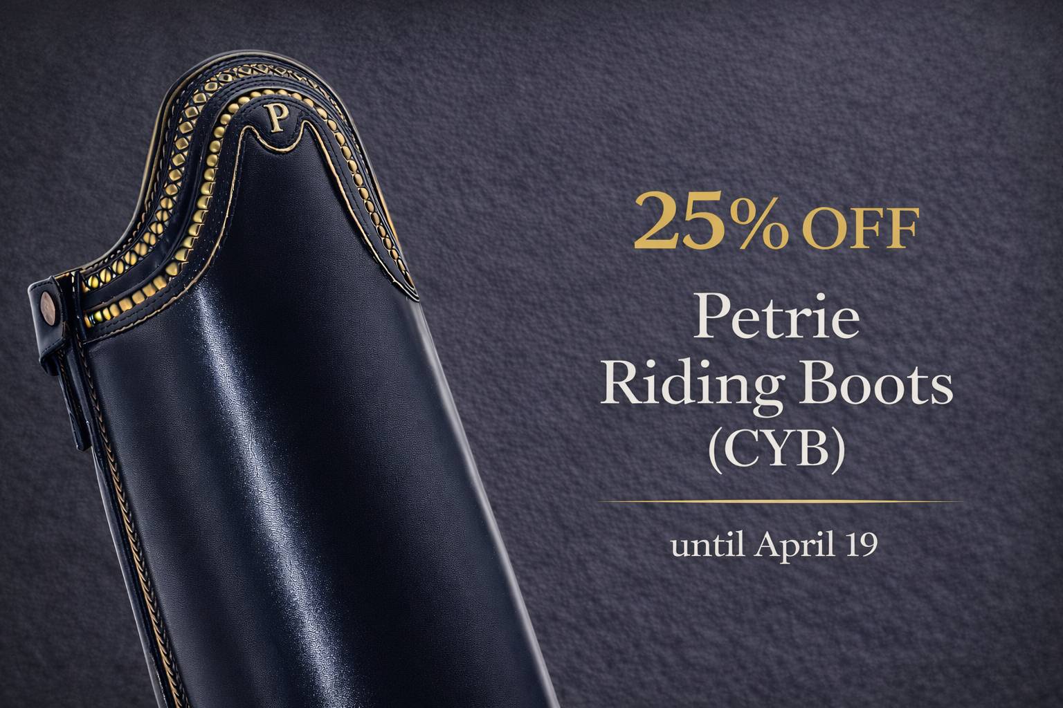 Petrie riding boots – standard, custom made and showroom sale Petrie riding boots are known for fit, durability and craftsmanship. We distinguish between standard series, CYB custom made boots and showroom sale models, each with its own characteristics.