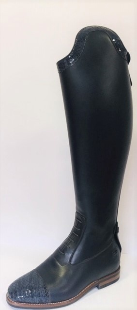 The Petrie Coventry is a lace-up Jumping boot with a rear zipper down the calf and a protective edging making it easy to slip on and off. A very flexible boot with a very tight fit throughout, even around the ankle.The shaft with its calf leather lining gives a great grip and good contact with the horse. There is an extra zipper guard and the heel protector, specially designed for spurs also protects the zipper.