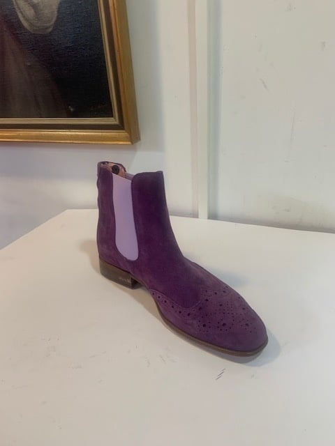The Petrie Oslo ankle boot is made of purple suede leather with a soft calfskin lining and an blue coloured elastic instep. The soft comfort sole and shaft makes this boot ideal for walking and hiking. Available in brown EU size 40.5